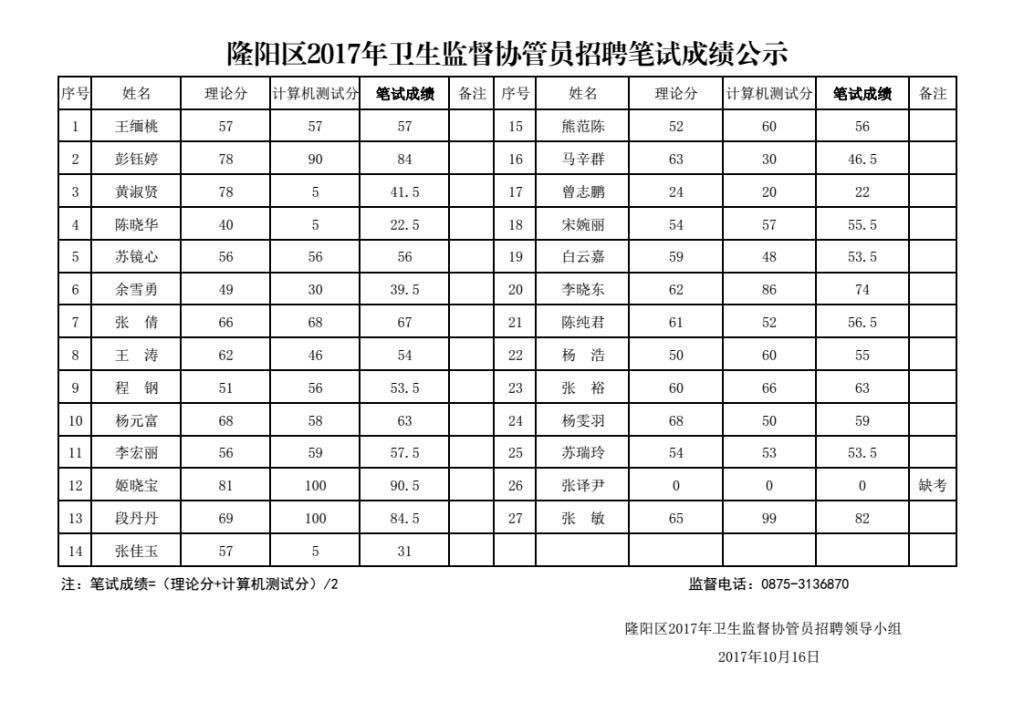 隆阳区2017年卫生监督协管员招聘笔试成绩公示